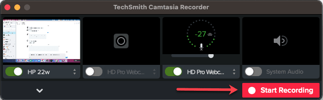 Once you launch the Camtasia recorder, you need to select the screen area you want to capture, select the right microphone, and then hit the Record button.