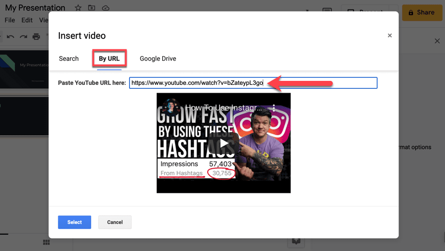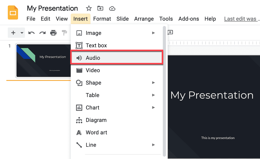 From the Insert menu, select Audio and pick the audio file from Google Drive.