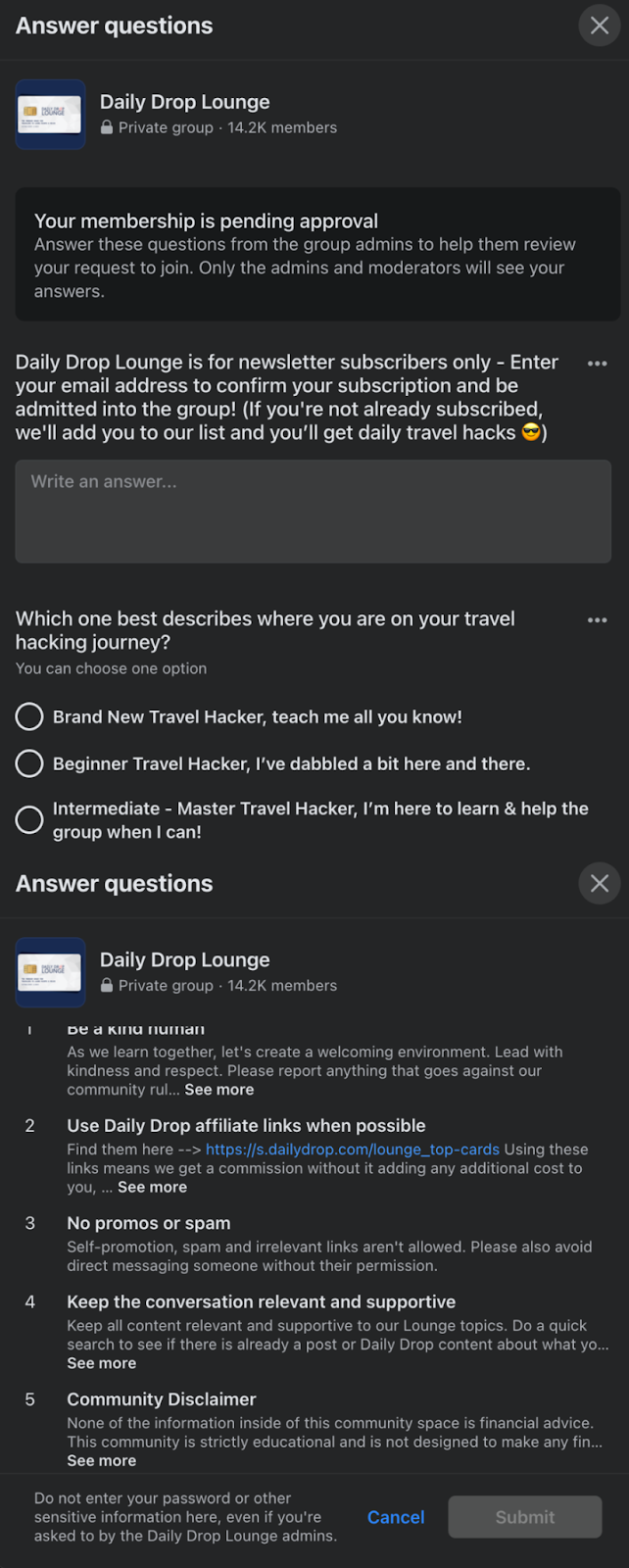 Most group owners simply bypass the community questions aspect of their Facebook groups. Or, if they don’t, they think primarily in terms of bot detection and security: keep the bad actors out of the group and only allow entrance to those who will actually contribute.