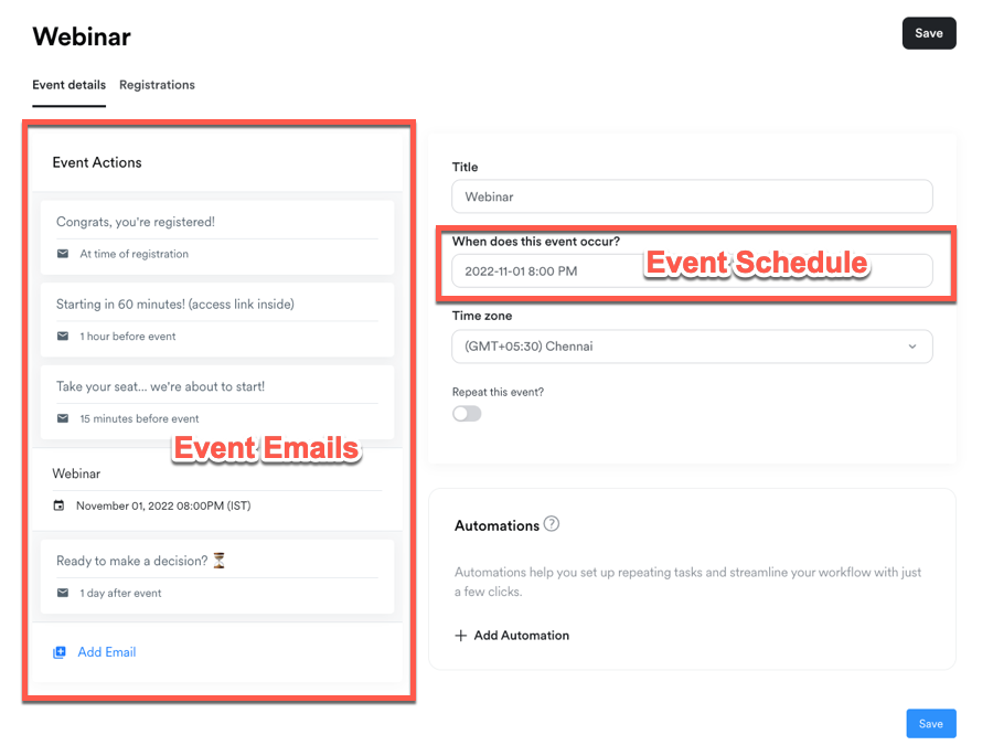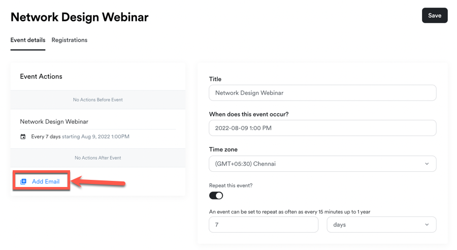 Let’s start by adding event emails. You can use these emails to notify your attendees about the webinar or follow up with them.
