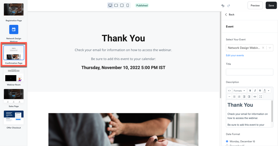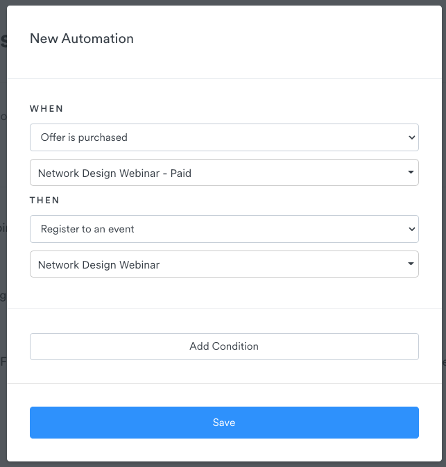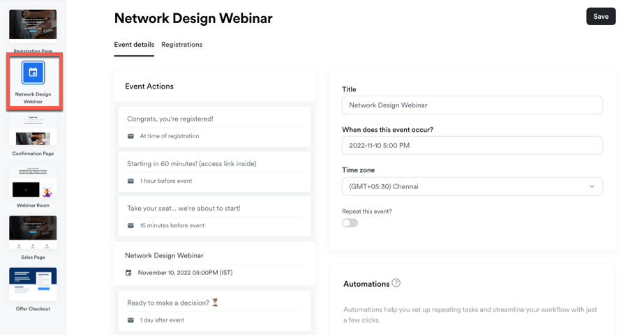 For example, if you want to offer a paid webinar, you can replace the default registration page with a sales page and a checkout page. You can then create an automation to automatically register the buyers to your event.
