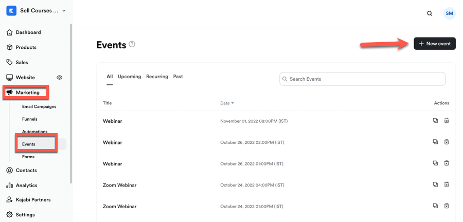 You can create a Kajabi event by selecting Marketing in Kajabi’s admin menu and clicking on + New Event. The website will take you to your new event page, where you can customize titles, times and dates, and even time zones.