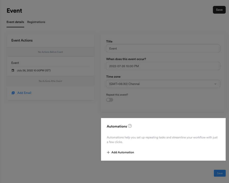 Once you click Save, Kajabi will create your event, and you can then do other settings, such as adding event emails and setting up automations.