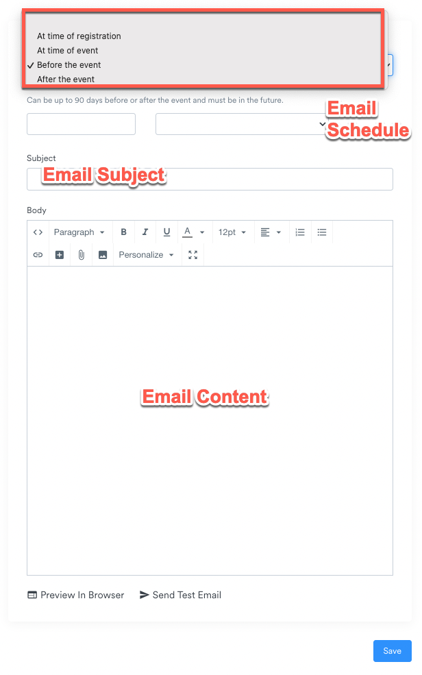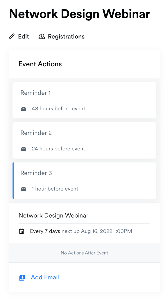For example, if you want to send reminders to your attendees 48 hours, 24 hours, and 1 hour before the event, you just need to create three different emails.