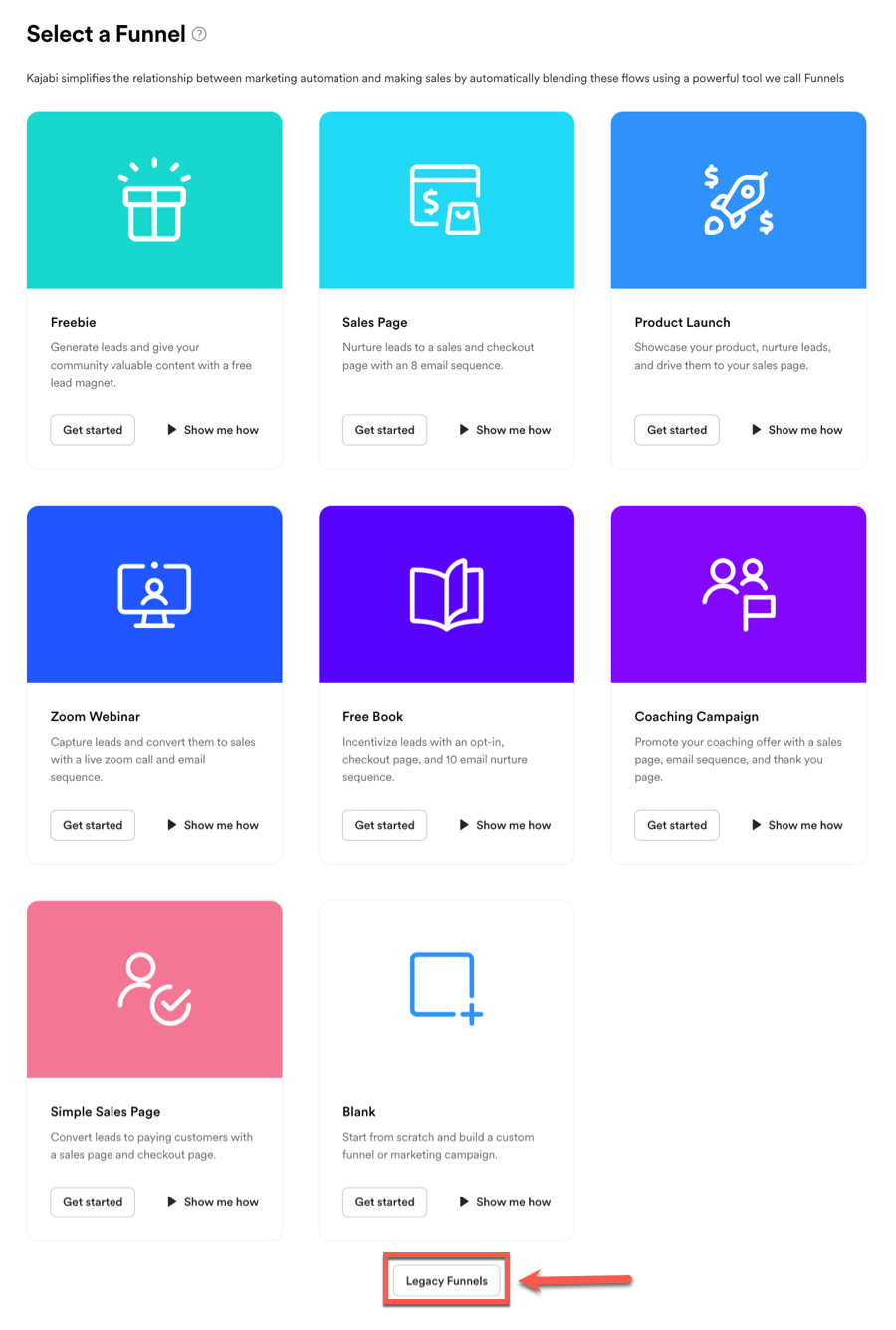 However, we’re going to use one of the legacy templates. For that, click on the Legacy Funnels button at the bottom of this page.