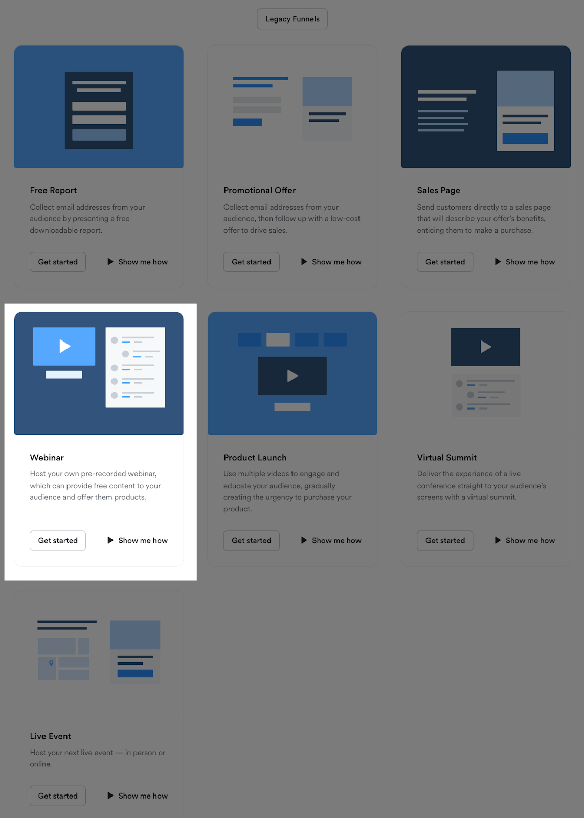 This will show you a bunch of additional templates. Select the one called Webinar to generate a live event blueprint funnel that will tie your event to your product and pages.