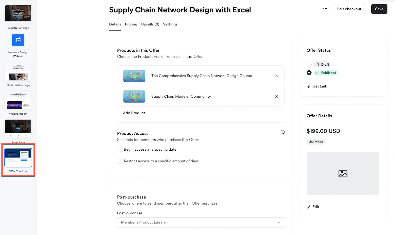 Finally, you’ll see the Offer Checkout at the end of your funnel. When you click on this, you’ll be able to configure the pricing, product access, and post-purchase flow. You can also customize your checkout page design here.