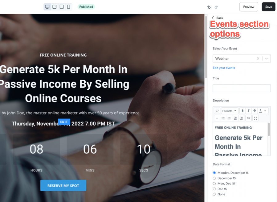 For example, when you click on the top Event section on your page, you’ll see options to select a different event, change the headings and description, modify the button, show a countdown timer, etc.