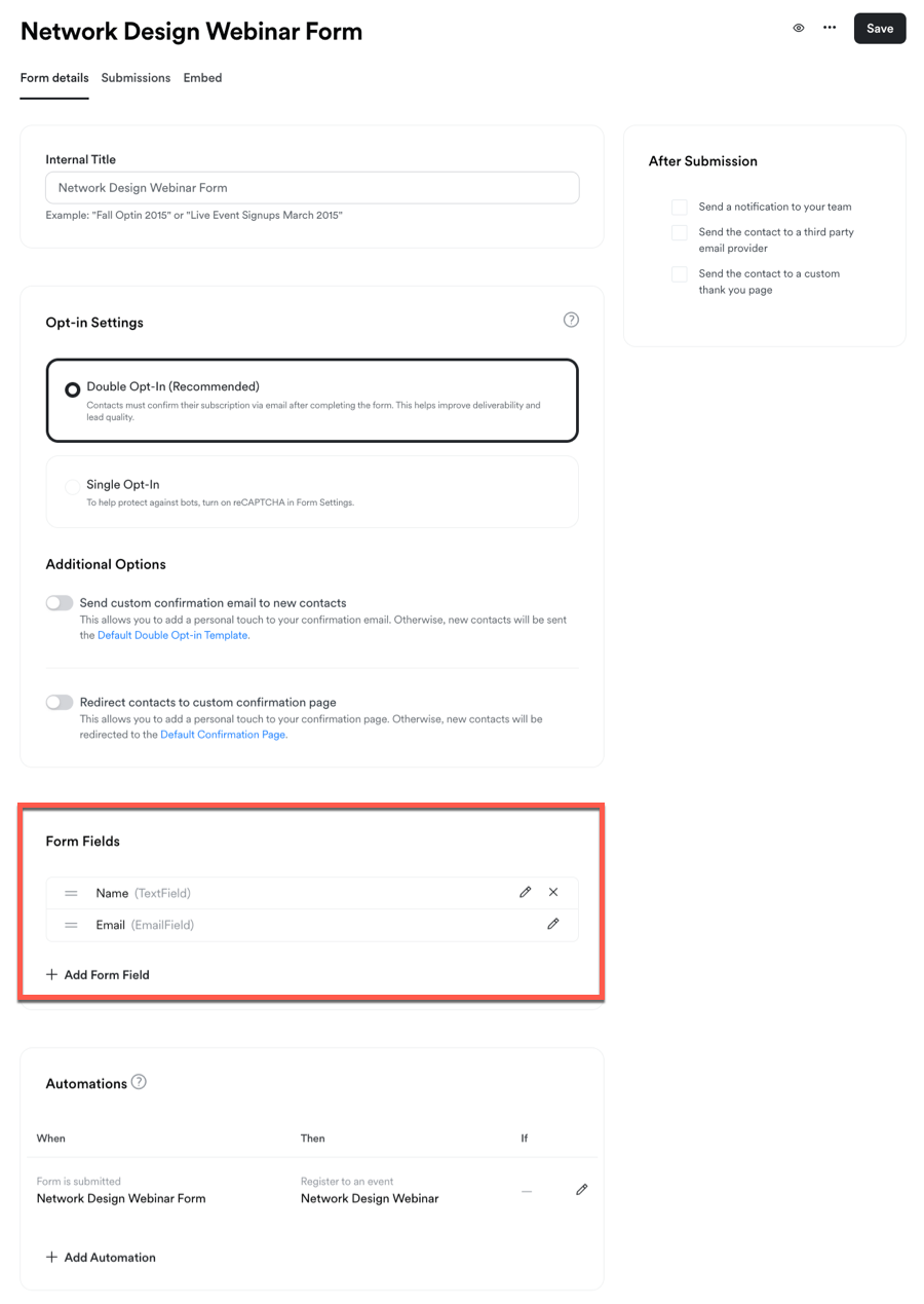 In the Form Fields section, you can decide what information to collect from your registrants. For example, if you want to collect their mobile number, you can create a new field here, which will automatically appear on your opt-in form.