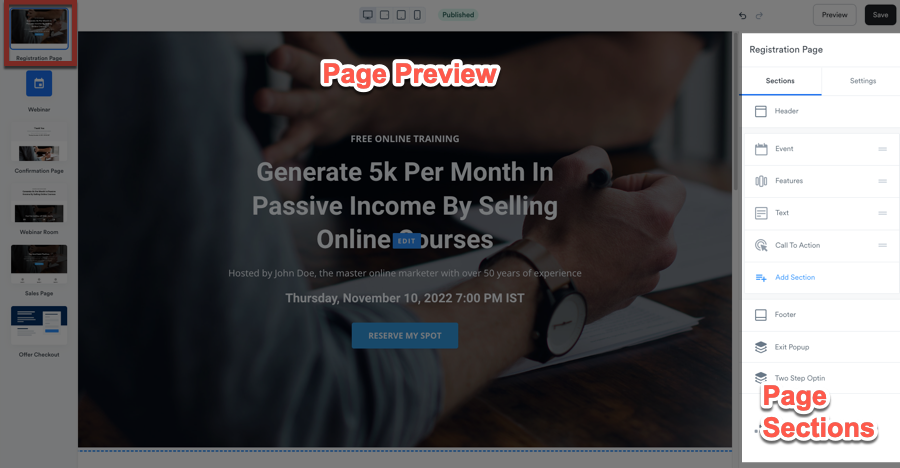 To customize the registration page, click on the icon in the funnel builder. This will open the page builder, where you’ll see a live preview of the page in the center and the sections and settings in the right panel.