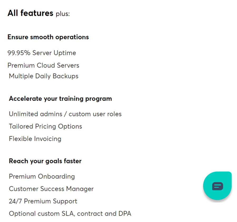 With this plan, all features come without limits, and you’ll also get a dedicated success manager, premium phone support, a 99.95% uptime guarantee, several backups per day, and premium cloud servers.