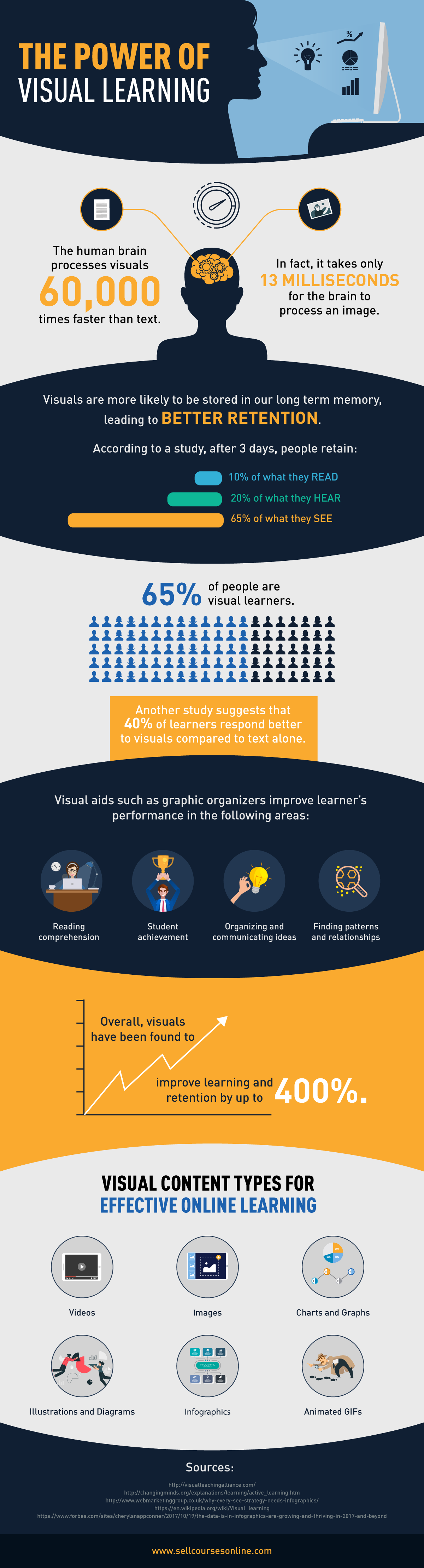 According to a study, visuals have been found to improve learning by up to 400 percent.