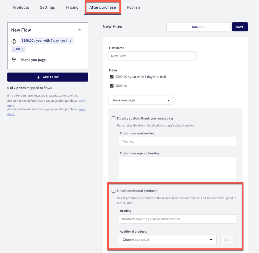 To create an upsell, go to the After Purchase section and click on Add Flow. Then you can choose the product you want to upsell to your members after purchase.