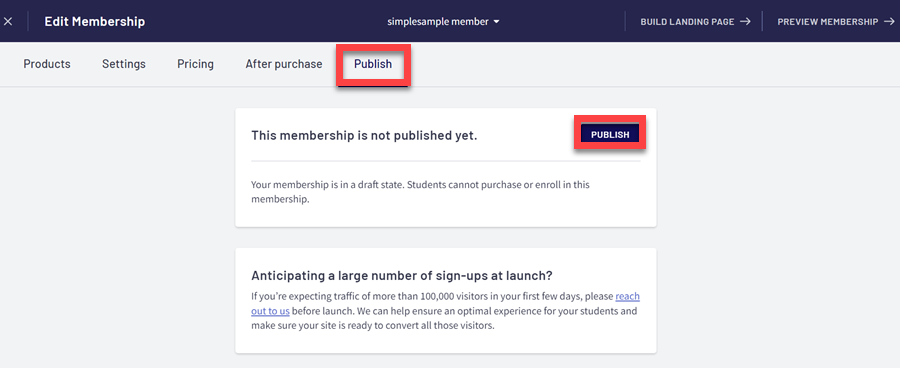 To make the membership live, go to the Publish Menu and click on the Publish button.