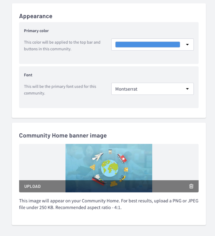 For example, you can customize the appearance of your community by choosing the primary color and the font. Then, you can upload a community home banner image.