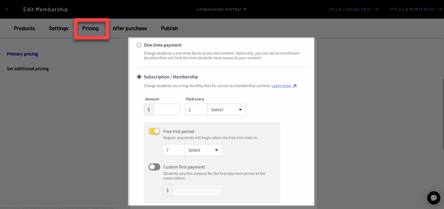 Thinkific offers many options for pricing your membership product, but we’re mainly concerned with subscriptions.