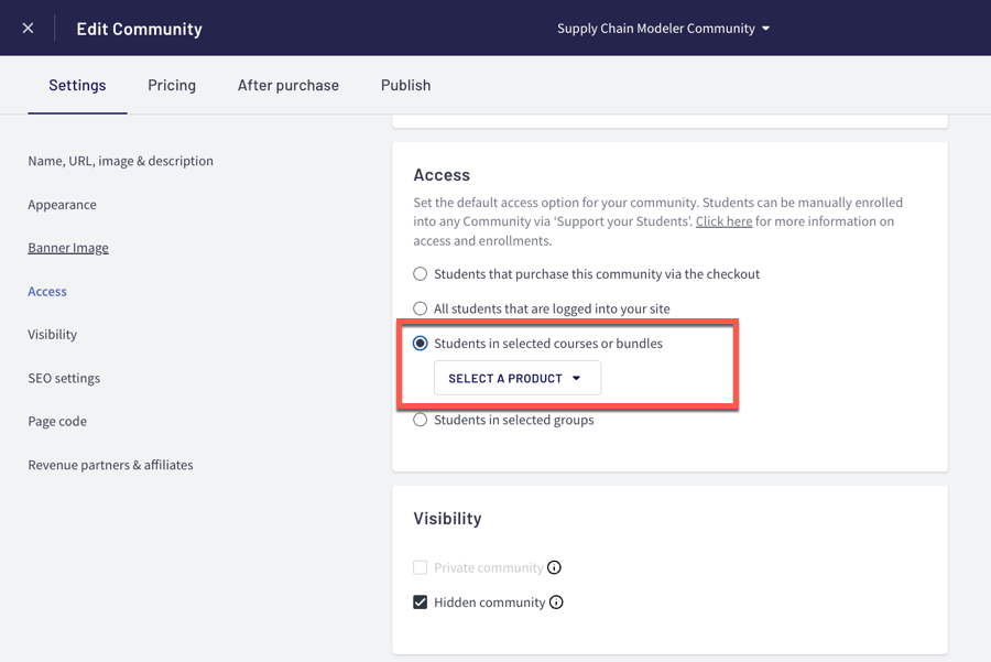 You’ll then see the settings for customizing access to the community, including the possibility of making it accessible to: