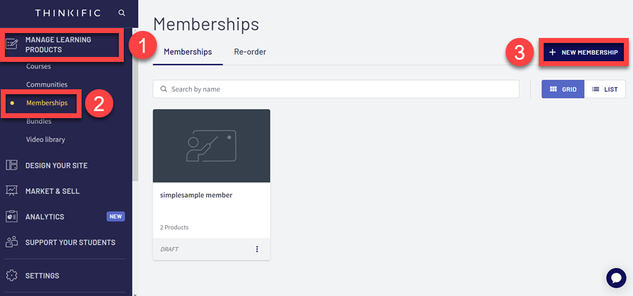 Afterward, go to Memberships under Manage Your Learning Products in your admin dashboard and click the New Membership button.