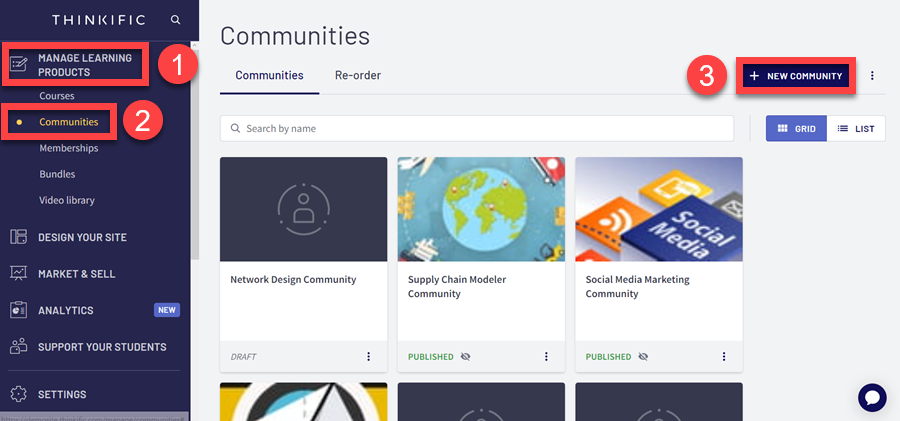 To create a community, go to Manage Learning Products in your admin dashboard, select Communities, and then click + New Community.