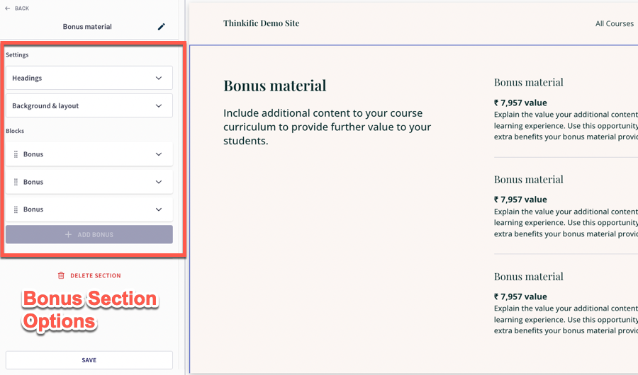 If you want to add a new section, click the Add Section button. Thinkific has over 20 section templates for you to choose from.