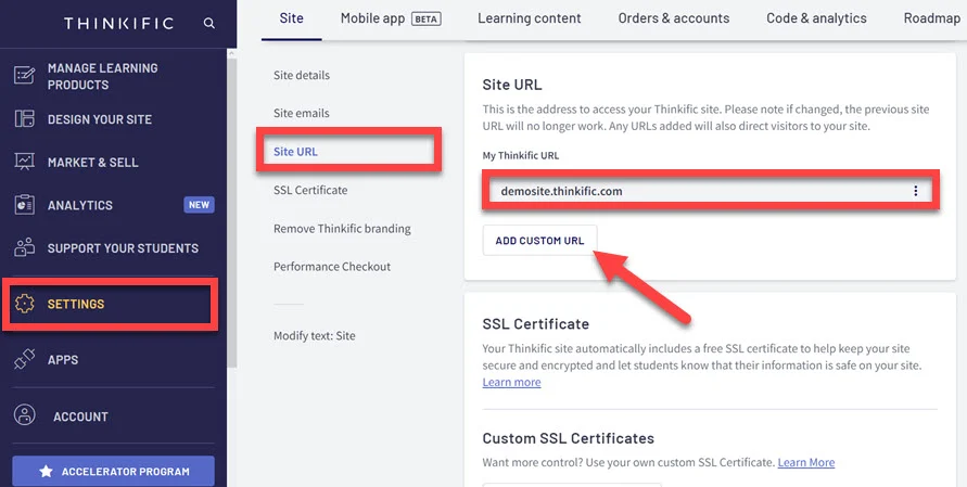 Not to worry, though. Thinkific allows you to change that URL and use a custom one instead. That way, your entire website will be on your own custom domain.