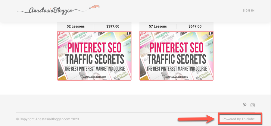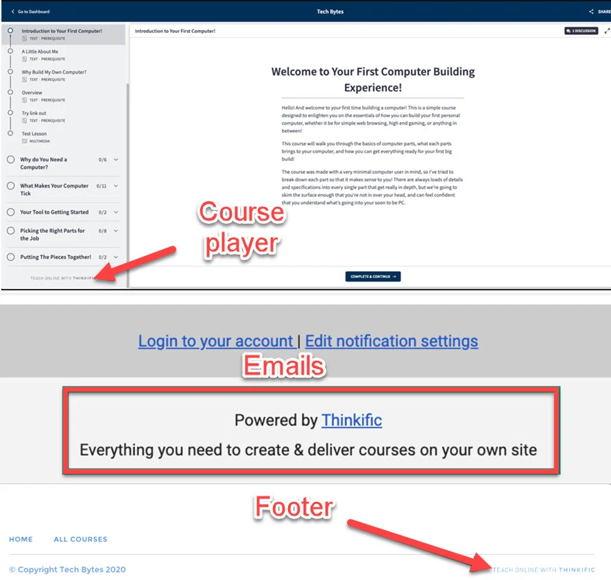 Before you decide to remove Thinkific’s branding, you should know where it’s shown by default. You’ll find the platform’s Teach Online With Thinkific and Powered By Thinkific tags in the following areas of your website: