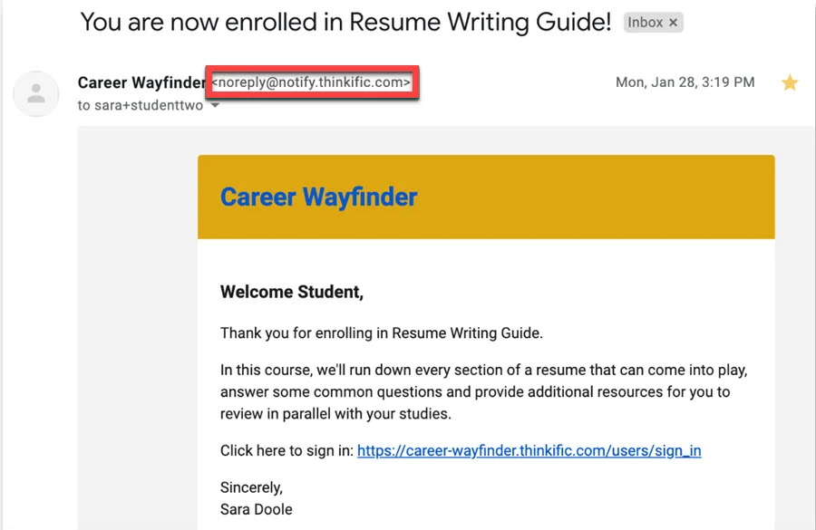 However, the email address that the emails came from will be Thinkific’s. The email prefix is “notifications” or “no reply,” and the part after the @ sign is “notify.thinkific.com.”