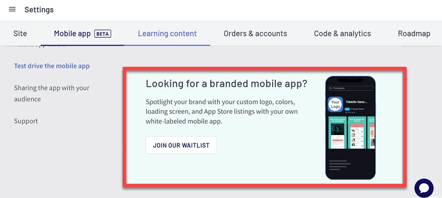 Meanwhile, Thinkific also has the option to get your own app with pretty much the same functionalities. The difference is that a white-label app is yours, and everything inside will align with your brand.