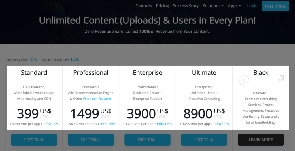The platform’s entry-level plan is the Standard plan which costs $399 per month. So while you don’t need to pay any transaction fees, you’ll have to pay an extra $299 per month per OTT app.