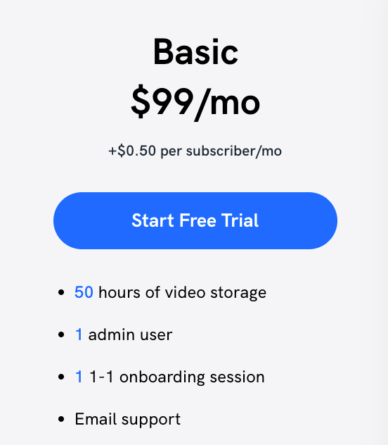 Uscreen’s Basic plan is the platform’s entry-level offering. It costs $99 per month, and in addition to the monthly fee, you’re also charged $0.50 per subscriber each month.