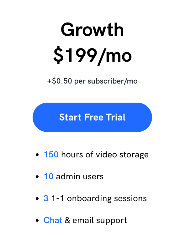 The second plan that Uscreen offers is the Growth plan. It costs $199 per month and still charges you $0.50 per month for each subscriber.