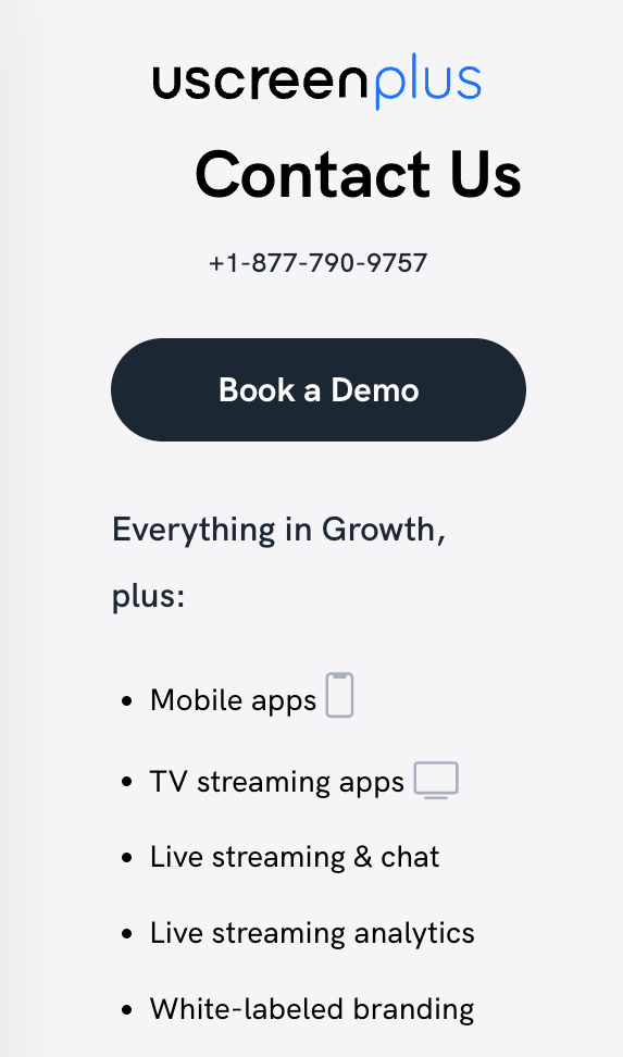 Uscreen Plus is the most comprehensive plan offered by the company. However, the pricing for this solution isn’t publicly disclosed, and you’ll have to schedule a call or book a demo to find out.