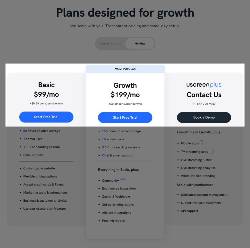 Uscreen isn’t just more reasonably priced than competitors but also has flexible pricing plans, which should work for everyone. Here’s a quick summary of the plans: