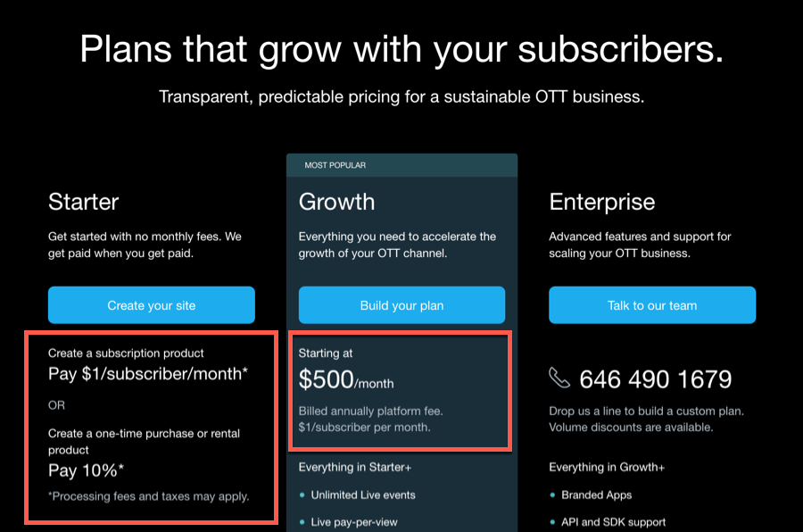 If you’re scaling your OTT business and require more video storage and third-party integrations, then the Growth plan will be your best option.